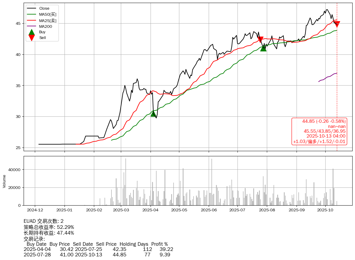 | 75 | ★EUAD | $44.88(-0.20 -0.44% 2025-10-13 15:59) | 📉回撤 2025-10-06 -5.01% (7天) 44.85(2025-10-13) → 47.22(2025-10-03) (-5.01%) | +52.29% | +47.44% | +4.86% | 2 | 偏多/1.52/-0.01 | 2024-12-05~2025-10-13 |