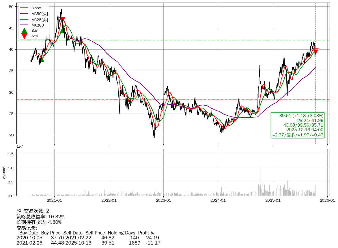 | 87 | ★FXI | $39.51(+1.17 +3.05% 2025-10-13 15:59) | 📉回撤 2021-02-18 -19.99% (1697天) 19.37(2022-10-31) → 49.38(2021-02-17) (-60.77%) | +10.32% | +4.80% | +5.52% | 2 | 偏多/1.97/0.43 | 2020-07-27~2025-10-13 |
