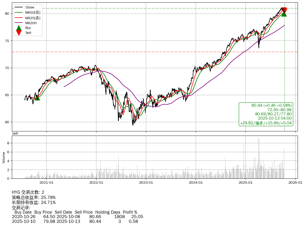 | 83 | ★HYG | $80.44(+0.47 +0.59% 2025-10-13 15:59) | 📈涨破 MA50 均线 📉回撤 2025-10-02 -0.64% (11天) 79.98(2025-10-10) → 80.95(2025-10-01) (-1.20%) | +25.78% | +24.71% | +1.06% | 2 | 偏多/15.93/0.04 | 2020-07-27~2025-10-13 |