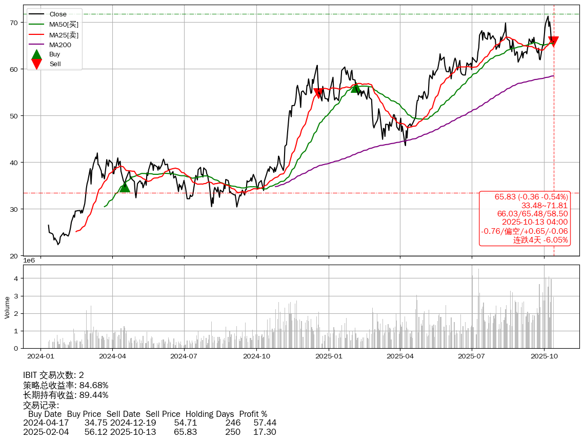 | 60 | ★IBIT | $65.81(-0.36 -0.54% 2025-10-13 15:59) | 📉跌破 MA25 均线 📉连跌4天 -6.05% 📉回撤 2025-10-07 -7.66% (6天) 65.83(2025-10-13) → 71.29(2025-10-06) (-7.66%) | +84.68% | +89.44% | -4.76% | 2 | 偏空/0.65/-0.06 | 2024-01-11~2025-10-13 |