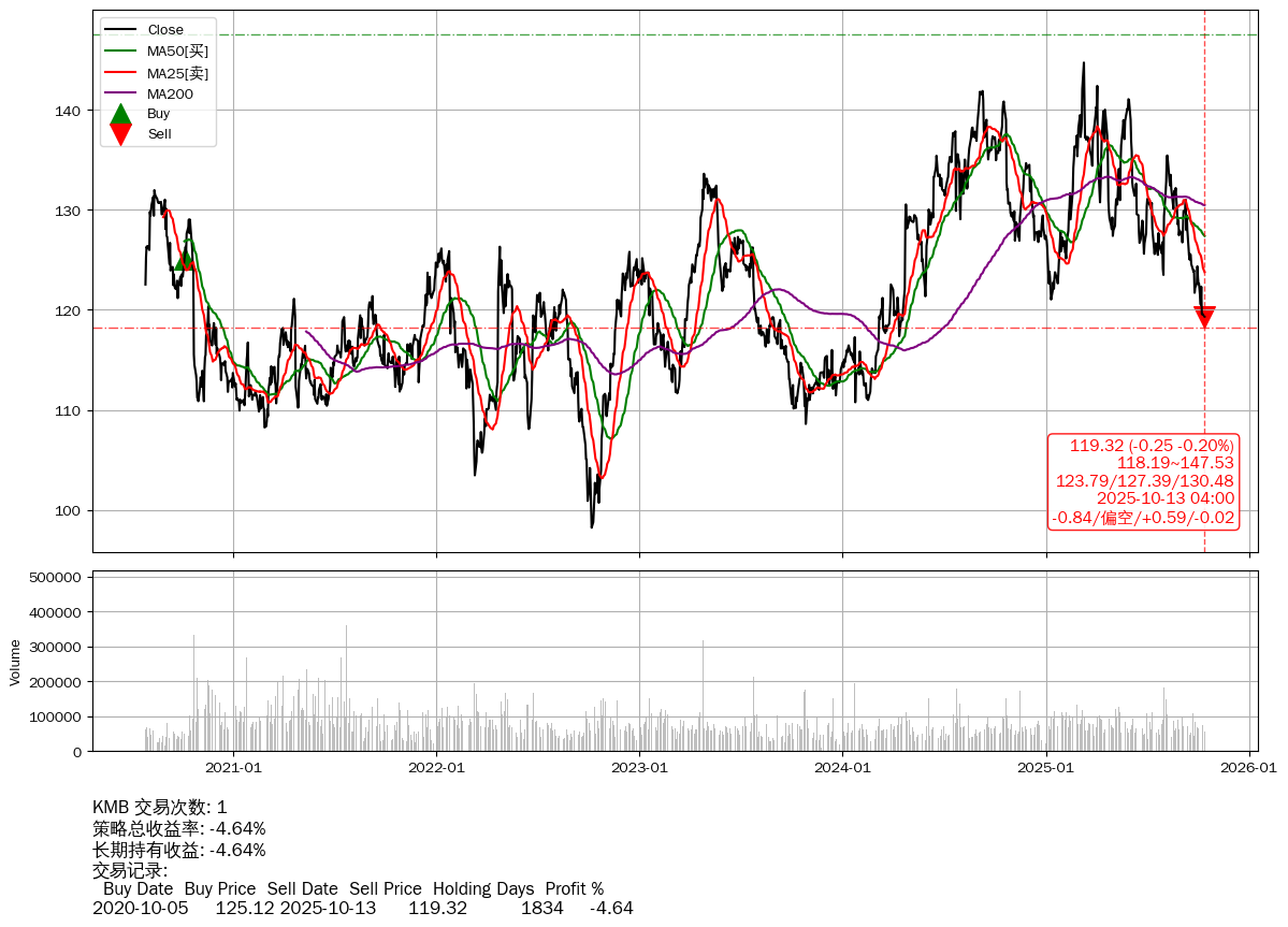 | 88 | ★KMB | $119.27(-0.28 -0.23% 2025-10-13 15:59) | 📉回撤 2025-03-11 -17.56% (216天) 119.32(2025-10-13) → 144.74(2025-03-10) (-17.56%) | -4.64% | -4.64% | -0.00% | 1 | 偏空/0.59/-0.02 | 2020-07-27~2025-10-13 |