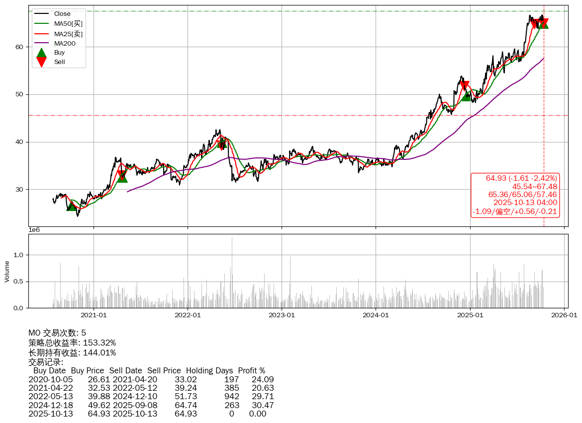 | 28 | ★MO | $64.93(-1.60 -2.40% 2025-10-13 15:59) | 📉跌破 MA5/10/25/50 均线 📉回撤 2025-10-08 -2.58% (5天) 64.93(2025-10-13) → 66.65(2025-10-07) (-2.58%) | +153.32% | +144.01% | +9.32% | 5 | 偏空/0.56/-0.21 | 2020-07-27~2025-10-13 |