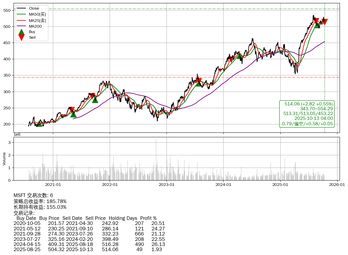 | 22 | ★MSFT | $513.97(+2.61 +0.51% 2025-10-13 15:59) | 📈涨破 MA25/50 均线 📉回撤 2025-08-05 -3.85% (69天) 494.96(2025-09-05) → 534.64(2025-08-04) (-7.42%) | +185.78% | +155.03% | +30.76% | 6 | 偏空/0.58/0.05 | 2020-07-27~2025-10-13 |