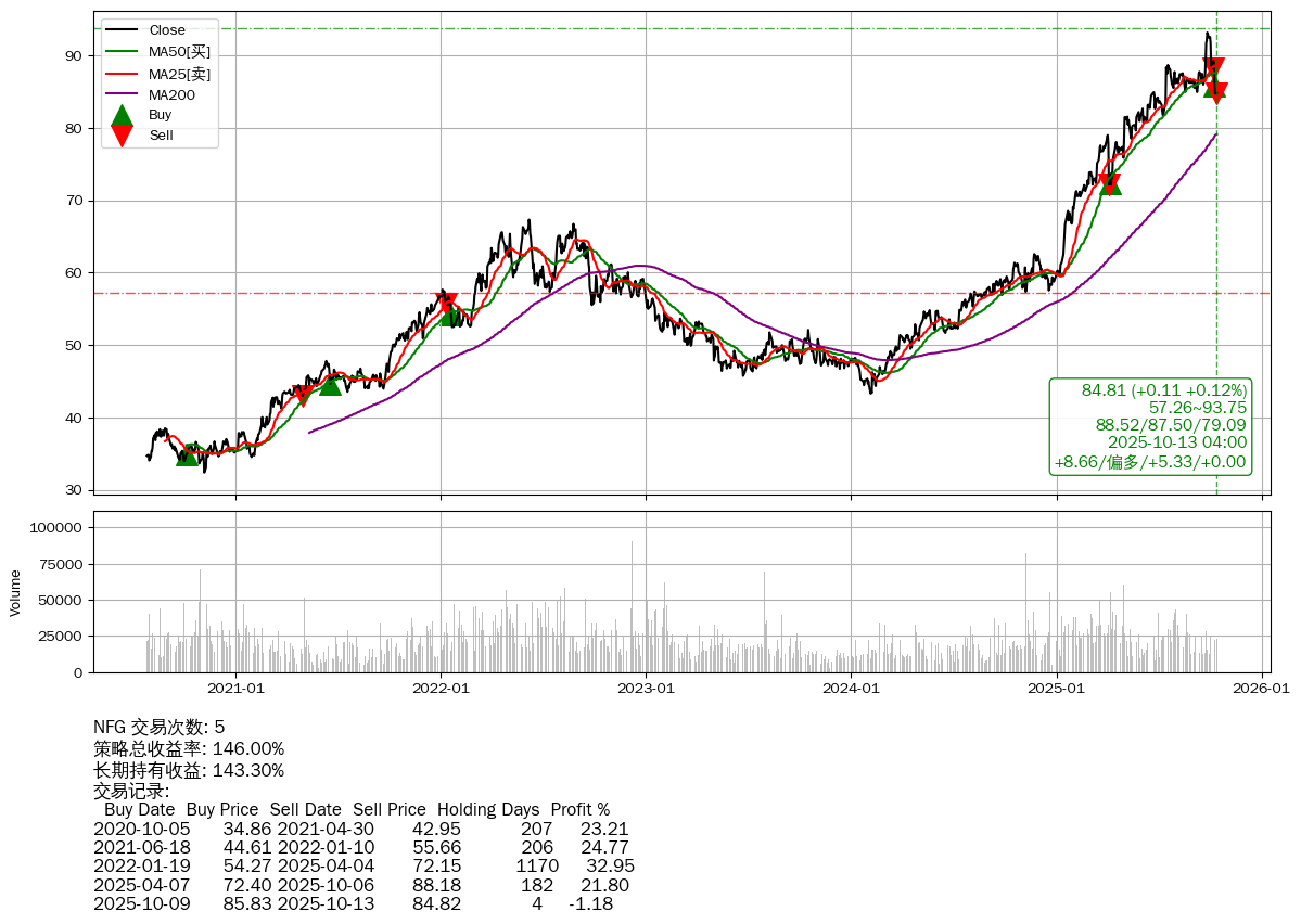 | 31 | ★NFG | $84.79(+0.04 +0.05% 2025-10-13 15:59) | 📉回撤 2025-09-29 -8.95% (14天) 84.71(2025-10-10) → 93.15(2025-09-26) (-9.06%) | +146.00% | +143.30% | +2.70% | 5 | 偏多/5.33/0.00 | 2020-07-27~2025-10-13 |