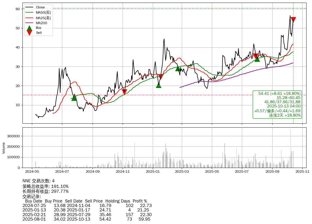 | 20 | NNE | $54.45(+8.60 +18.76% 2025-10-13 15:59) | 📈涨破 MA5/10 均线 📈连涨2天 +18.80% 📉回撤 2025-10-08 -3.74% (5天) 45.80(2025-10-10) → 56.53(2025-10-07) (-18.97%) | +191.10% | +297.77% | -106.67% | 4 | 偏多/0.44/1.69 | 2024-05-08~2025-10-13 |