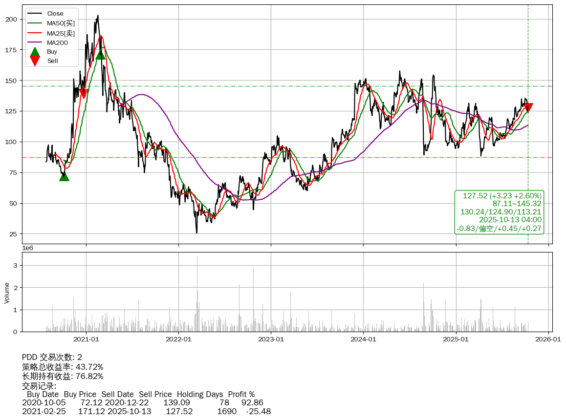| 78 | ★PDD | $127.56(+3.27 +2.63% 2025-10-13 15:59) | 📈涨破 MA50 均线 📉回撤 2021-02-18 -37.12% (1697天) 25.53(2022-03-14) → 202.80(2021-02-17) (-87.41%) | +43.72% | +76.82% | -33.10% | 2 | 偏空/0.45/0.27 | 2020-07-27~2025-10-13 |