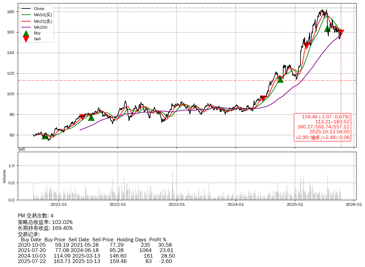 | 52 | PM | $159.46(-1.02 -0.64% 2025-10-13 15:59) | 📉跌破 MA25 均线 📉回撤 2025-06-24 -12.33% (111天) 153.23(2025-10-03) → 181.88(2025-06-23) (-15.75%) | +102.02% | +169.40% | -67.38% | 4 | 偏多/2.48/-0.06 | 2020-07-27~2025-10-13 |