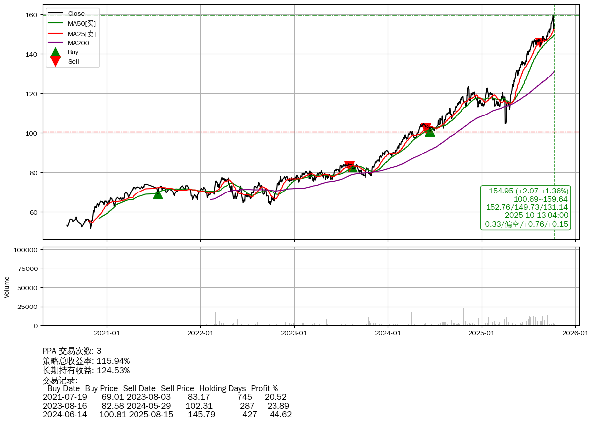 | 42 | ★PPA | $155.06(+2.16 +1.41% 2025-10-13 15:59) | 📉回撤 2025-10-09 -2.94% (4天) 152.88(2025-10-10) → 159.64(2025-10-08) (-4.24%) | +115.94% | +124.53% | -8.60% | 3 | 偏空/0.76/0.15 | 2020-07-29~2025-10-13 |