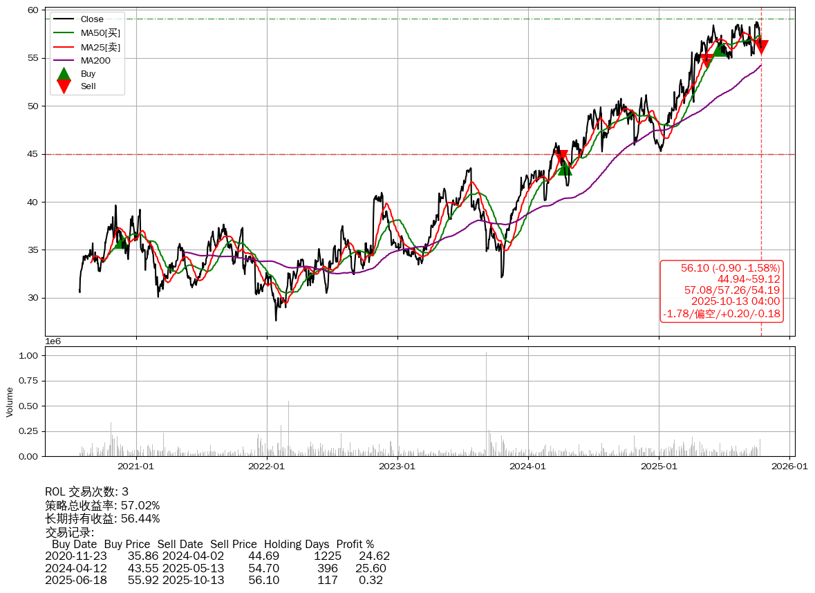 | 73 | ★ROL | $56.10(-0.91 -1.60% 2025-10-13 15:59) | 📉跌破 MA100 均线 📉回撤 2025-10-01 -4.51% (12天) 56.10(2025-10-13) → 58.75(2025-09-30) (-4.51%) | +57.02% | +56.44% | +0.58% | 3 | 偏空/0.2/-0.18 | 2020-07-27~2025-10-13 |