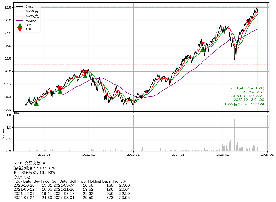 | 32 | ★SCHG | $32.03(+0.64 +2.04% 2025-10-13 15:59) | 📈涨破 MA25 均线 📉回撤 2025-10-09 -1.48% (4天) 31.39(2025-10-10) → 32.51(2025-10-08) (-3.43%) | +137.89% | +131.93% | +5.96% | 4 | 偏空/0.27/0.24 | 2020-07-30~2025-10-13 |
