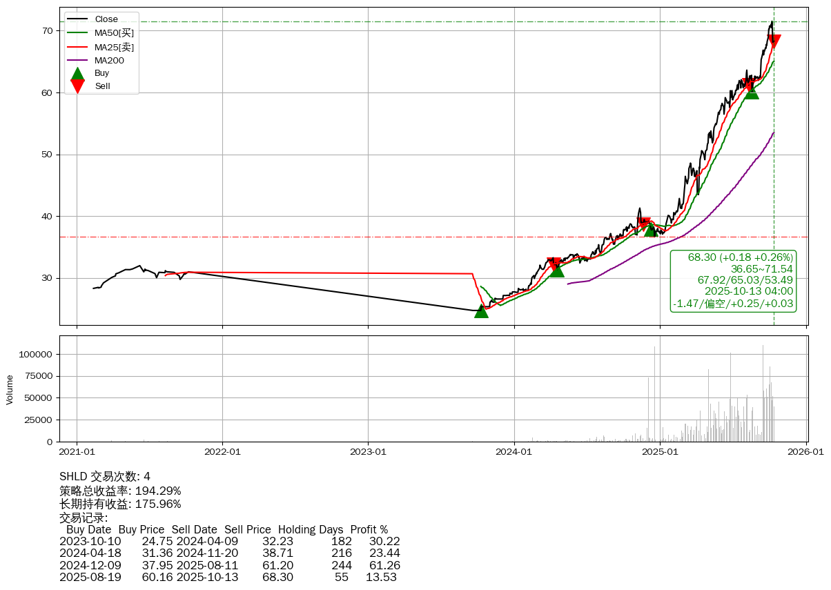 | 18 | ★SHLD | $68.33(+0.21 +0.31% 2025-10-13 15:59) | 📉回撤 2025-10-09 -4.49% (4天) 68.12(2025-10-10) → 71.51(2025-10-08) (-4.74%) | +194.29% | +175.96% | +18.33% | 4 | 偏空/0.25/0.03 | 2021-02-12~2025-10-13 |