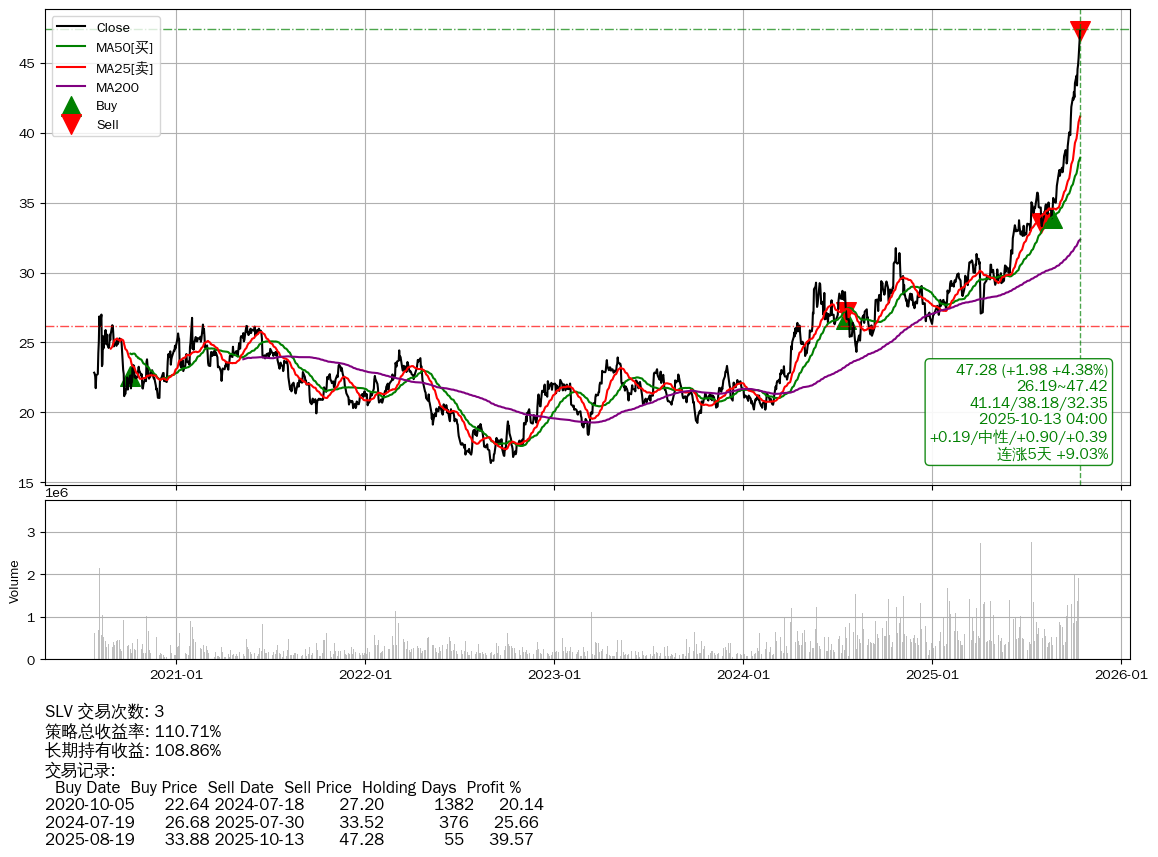 | 46 | ★SLV | $47.30(+2.02 +4.46% 2025-10-13 15:59) | 📈连涨5天 +9.03% | +110.71% | +108.86% | +1.85% | 3 | 中性/0.9/0.39 | 2020-07-27~2025-10-13 |