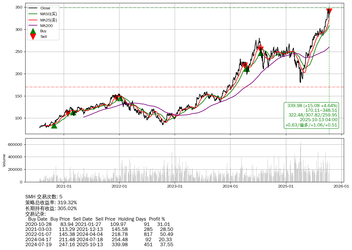 | 9 | ★SMH | $340.02(+15.16 +4.67% 2025-10-13 15:59) | 📈涨破 MA5/10 均线 📉回撤 2025-10-09 -1.79% (4天) 324.90(2025-10-10) → 346.17(2025-10-08) (-6.14%) | +319.32% | +305.02% | +14.30% | 5 | 偏多/1.06/0.51 | 2020-07-27~2025-10-13 |