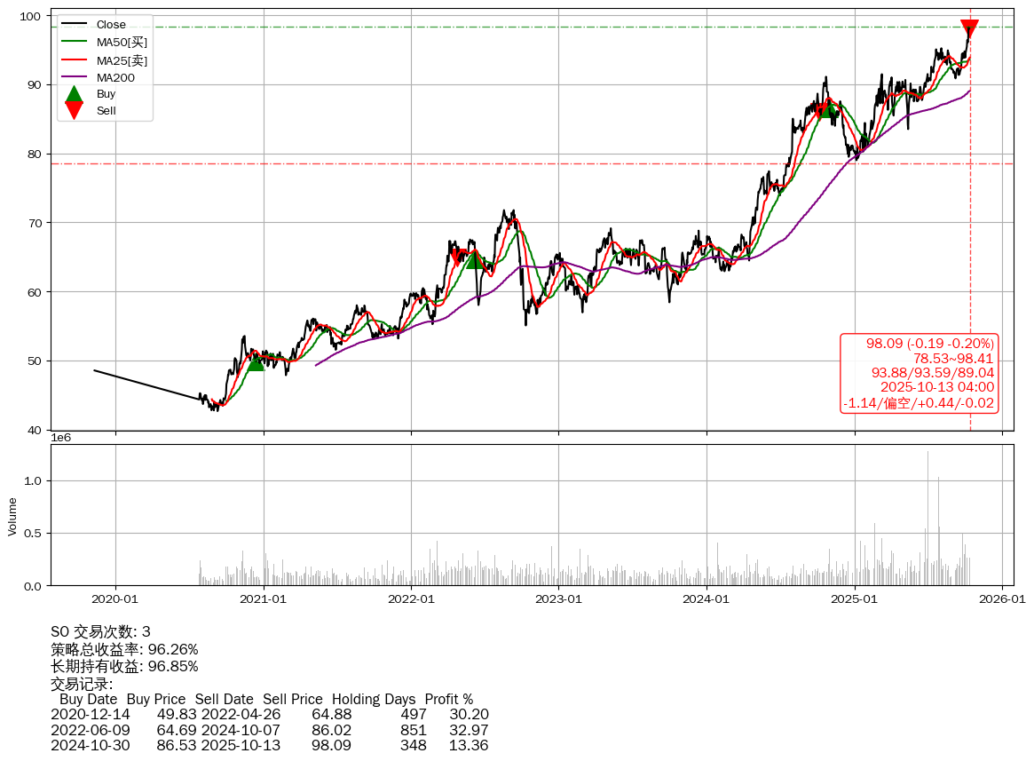 | 56 | ★SO | $98.09(-0.19 -0.19% 2025-10-13 15:59) | 📉回撤 2025-10-13 -0.20% (0天) 98.09(2025-10-13) → 98.28(2025-10-10) (-0.20%) | +96.26% | +96.85% | -0.59% | 3 | 偏空/0.44/-0.02 | 2019-11-11~2025-10-13 |