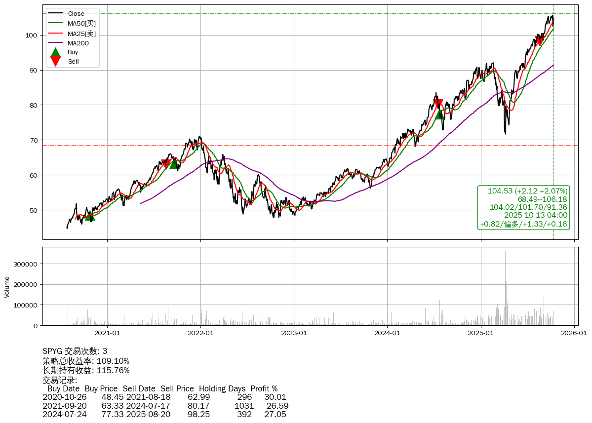 | 48 | ★SPYG | $104.54(+2.10 +2.05% 2025-10-13 15:59) | 📈涨破 MA25 均线 📉回撤 2025-10-09 -1.03% (4天) 102.41(2025-10-10) → 105.62(2025-10-08) (-3.04%) | +109.10% | +115.76% | -6.66% | 3 | 偏多/1.33/0.16 | 2020-07-27~2025-10-13 |