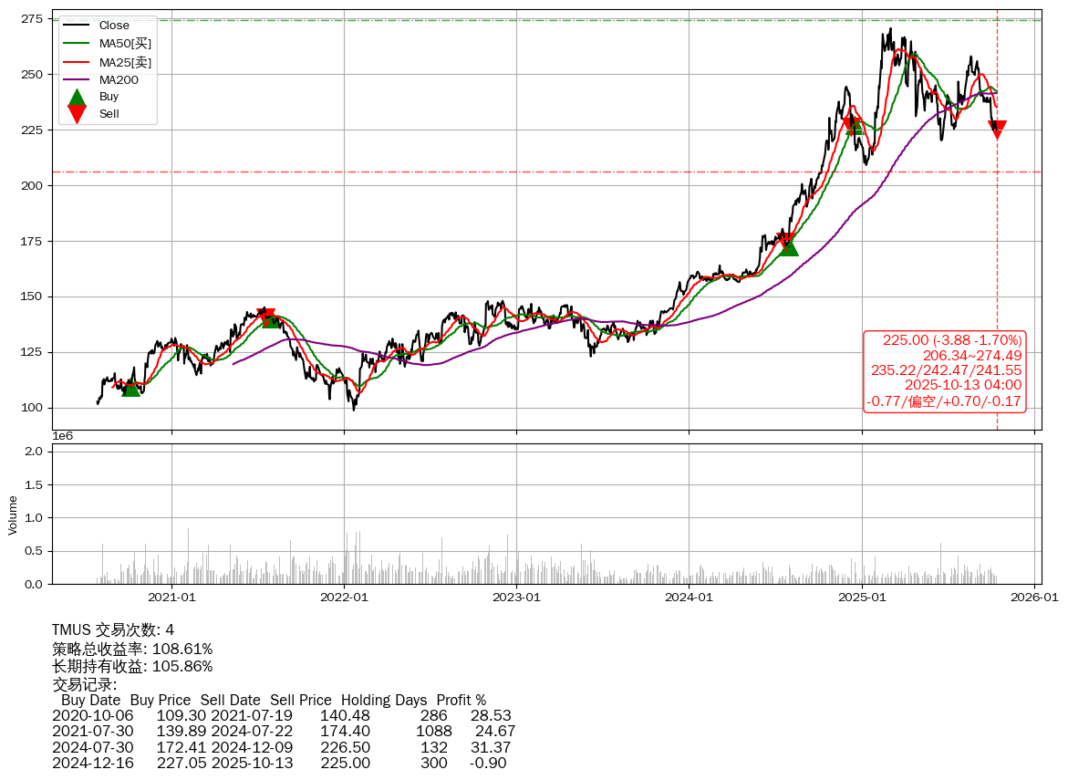 | 49 | TMUS | $225.05(-3.91 -1.71% 2025-10-13 15:59) | 📉跌破 MA5 均线 📉回撤 2025-03-04 -16.89% (222天) 220.18(2025-06-18) → 270.73(2025-03-03) (-18.67%) | +108.61% | +105.86% | +2.76% | 4 | 偏空/0.7/-0.17 | 2020-07-27~2025-10-13 |