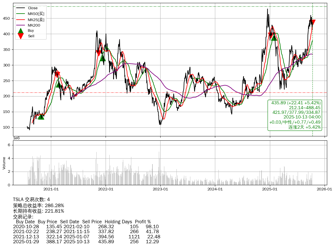| 10 | ★TSLA | $435.90(+22.60 +5.47% 2025-10-13 15:59) | 📈涨破 MA5/25 均线 📈连涨2天 +5.42% 📉回撤 2024-12-18 -9.16% (298天) 221.89(2025-04-08) → 479.86(2024-12-17) (-53.76%) | +286.28% | +221.81% | +64.47% | 4 | 中性/0.77/0.49 | 2020-07-27~2025-10-13 |
