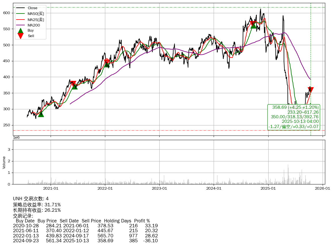 | 82 | ★UNH | $358.58(+4.17 +1.18% 2025-10-13 15:59) | 📈涨破 MA10 均线 📉回撤 2024-11-12 -41.42% (334天) 236.20(2025-08-01) → 612.30(2024-11-11) (-61.42%) | +31.71% | +26.21% | +5.50% | 4 | 偏空/0.33/0.07 | 2020-07-27~2025-10-13 |
