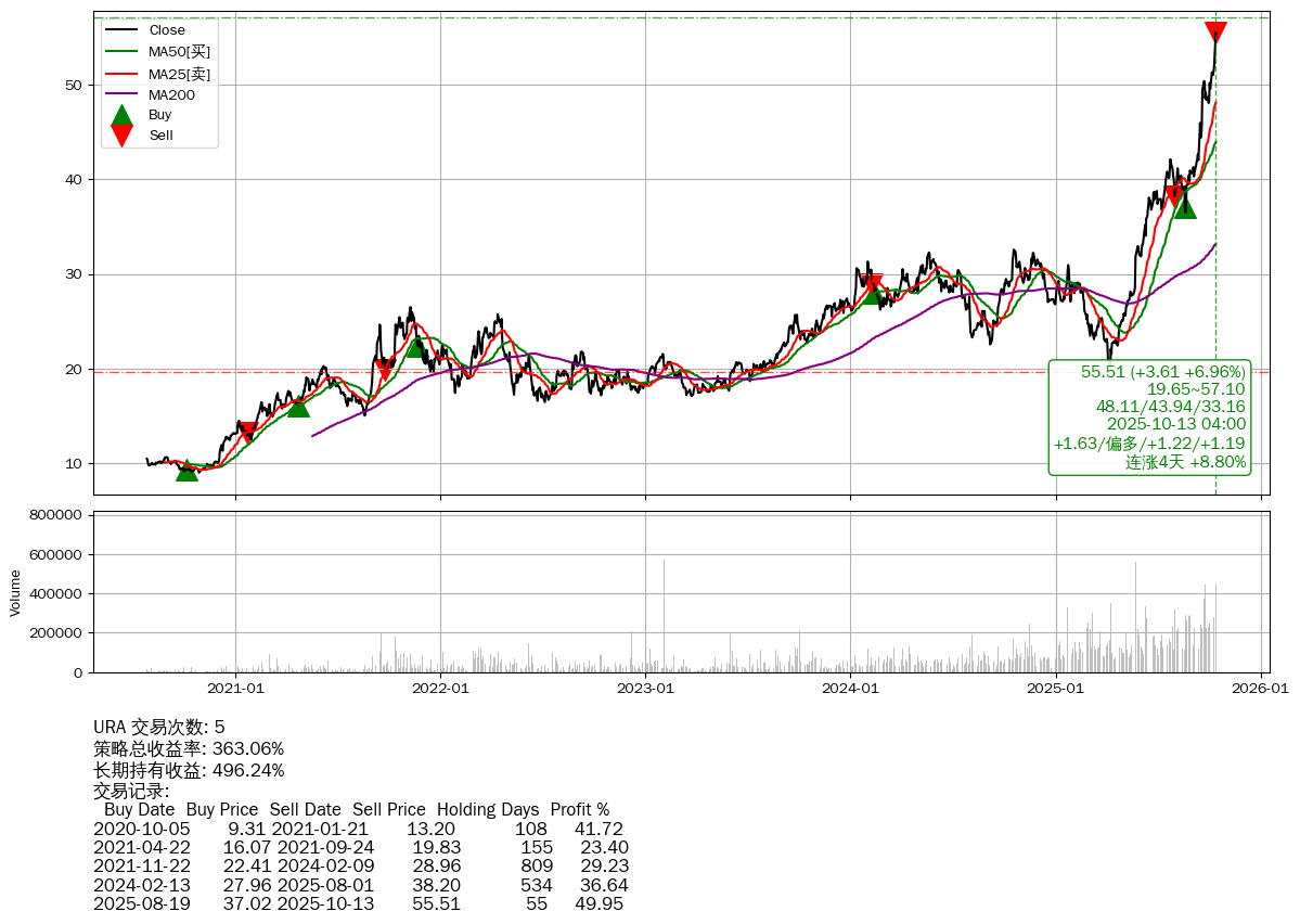 | 8 | ★URA | $55.51(+3.65 +7.04% 2025-10-13 15:59) | 📈涨破 MA5 均线 📈连涨4天 +8.80% | +363.06% | +496.24% | -133.18% | 5 | 偏多/1.22/1.19 | 2020-07-27~2025-10-13 |