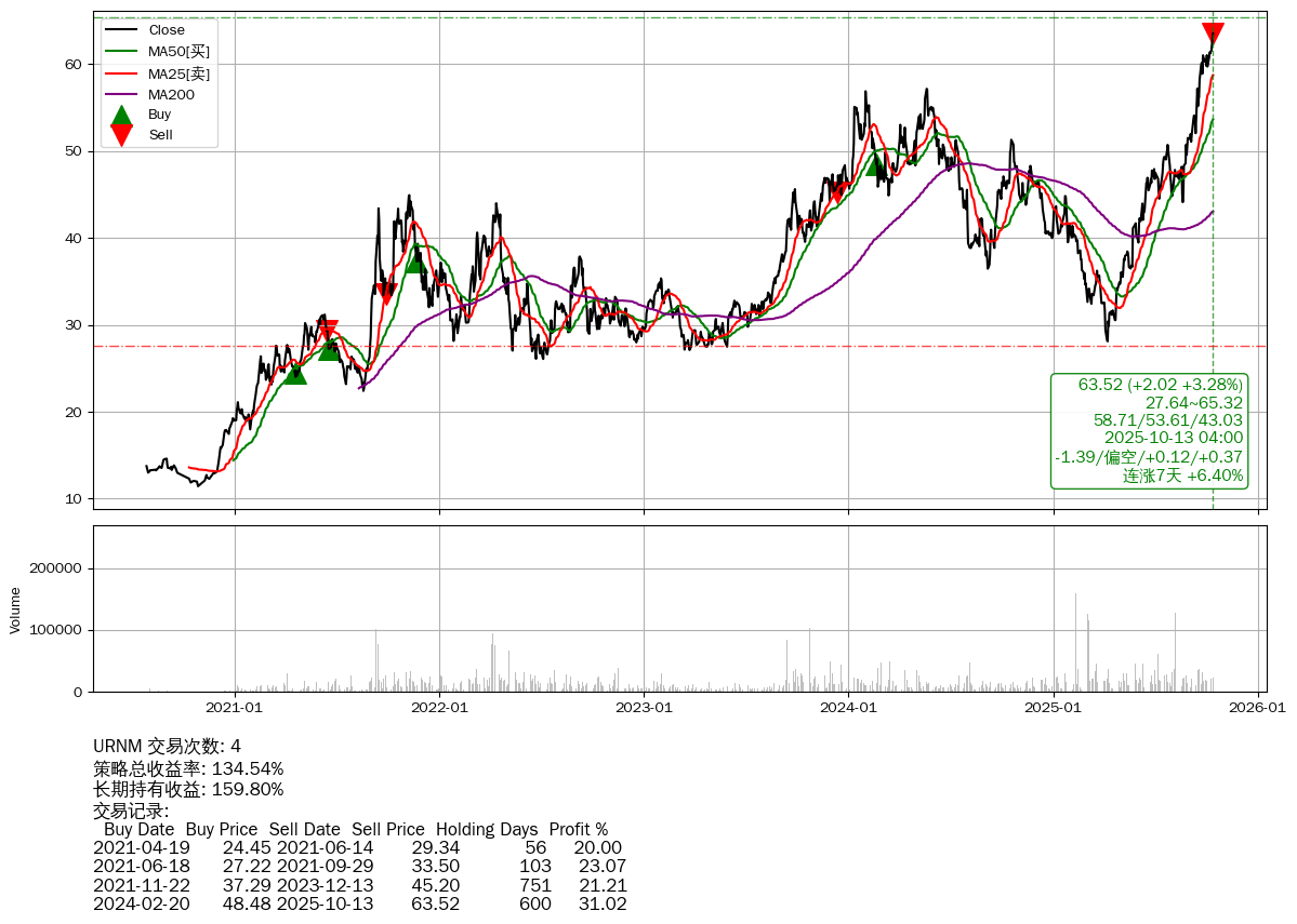 | 33 | ★URNM | $63.46(+1.88 +3.05% 2025-10-13 15:59) | 📈涨破 MA5 均线 📈连涨7天 +6.40% | +134.54% | +159.80% | -25.26% | 4 | 偏空/0.12/0.37 | 2020-07-28~2025-10-13 |