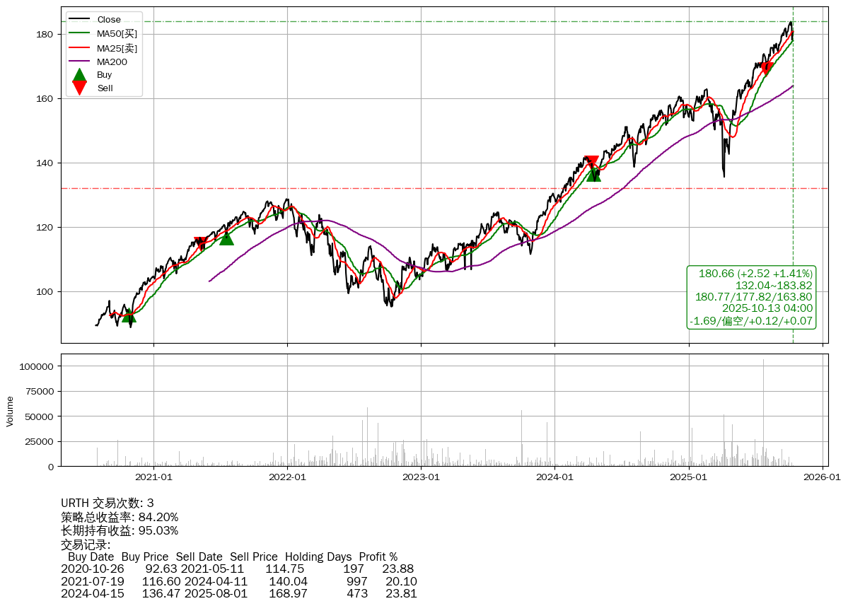 | 62 | ★URTH | $180.60(+2.40 +1.35% 2025-10-13 15:59) | 📉回撤 2025-10-07 -1.69% (6天) 178.13(2025-10-10) → 183.75(2025-10-06) (-3.06%) | +84.20% | +95.03% | -10.82% | 3 | 偏空/0.12/0.07 | 2020-07-27~2025-10-13 |