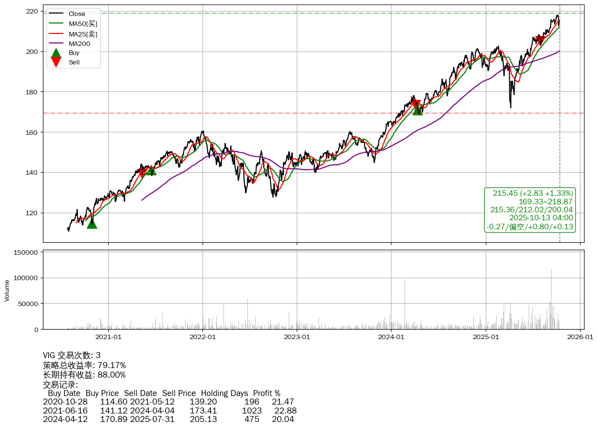 | 65 | ★VIG | $215.40(+2.75 +1.29% 2025-10-13 15:59) | 📈涨破 MA25 均线 📉回撤 2025-10-09 -1.08% (4天) 212.62(2025-10-10) → 217.81(2025-10-06) (-2.38%) | +79.17% | +88.00% | -8.83% | 3 | 中性/0.86/0.13 | 2020-07-27~2025-10-13 |