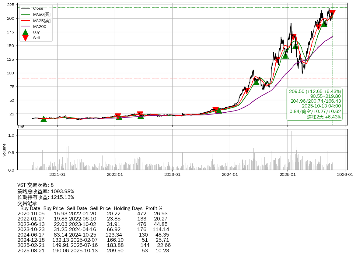 | 2 | ★VST | $209.53(+12.57 +6.38% 2025-10-13 15:59) | 📈涨破 MA5/10/25/50 均线 📈连涨2天 +6.43% 📉回撤 2025-09-23 -3.86% (20天) 195.90(2025-09-30) → 217.91(2025-09-22) (-10.10%) | +1093.98% | +1215.13% | -121.15% | 8 | 偏空/0.27/0.62 | 2020-07-27~2025-10-13 |