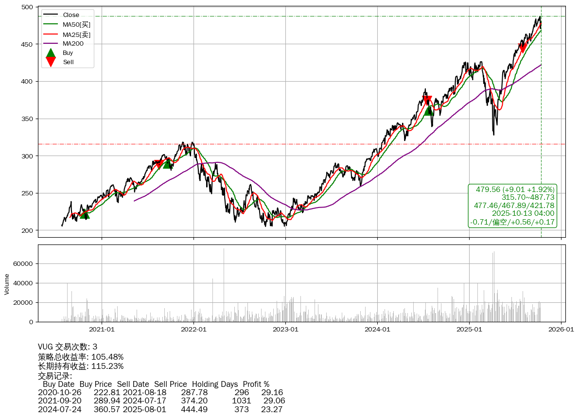 | 51 | ★VUG | $479.51(+8.94 +1.90% 2025-10-13 15:59) | 📈涨破 MA25 均线 📉回撤 2025-10-09 -1.53% (4天) 470.54(2025-10-10) → 487.00(2025-10-08) (-3.38%) | +105.48% | +115.23% | -9.75% | 3 | 偏空/0.56/0.17 | 2020-07-27~2025-10-13 |