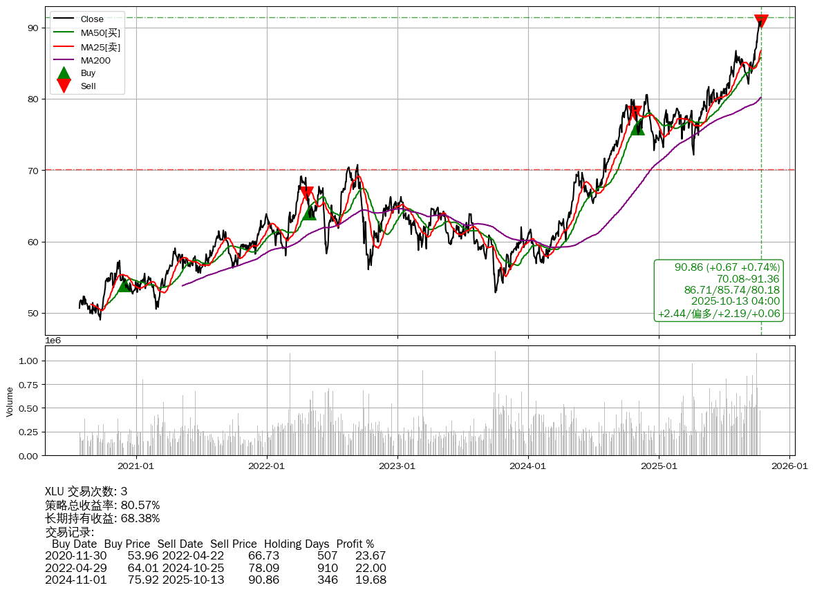 | 64 | XLU | $90.86(+0.66 +0.73% 2025-10-13 15:59) | 📈涨破 MA5 均线 | +80.57% | +68.38% | +12.19% | 3 | 偏多/2.19/0.06 | 2020-07-27~2025-10-13 |