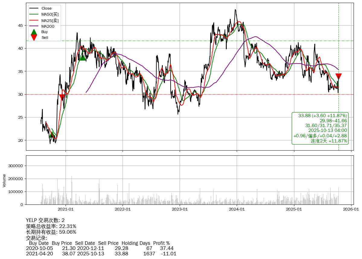 | 84 | YELP | $33.83(+3.56 +11.76% 2025-10-13 15:59) | 📈涨破 MA5/10/25/50/100 均线 📈连涨2天 +11.87% 📉回撤 2023-12-26 -30.04% (656天) 30.29(2025-10-10) → 48.43(2023-12-22) (-37.47%) | +22.31% | +59.06% | -36.75% | 2 | 偏多/0.04/2.88 | 2020-07-27~2025-10-13 |