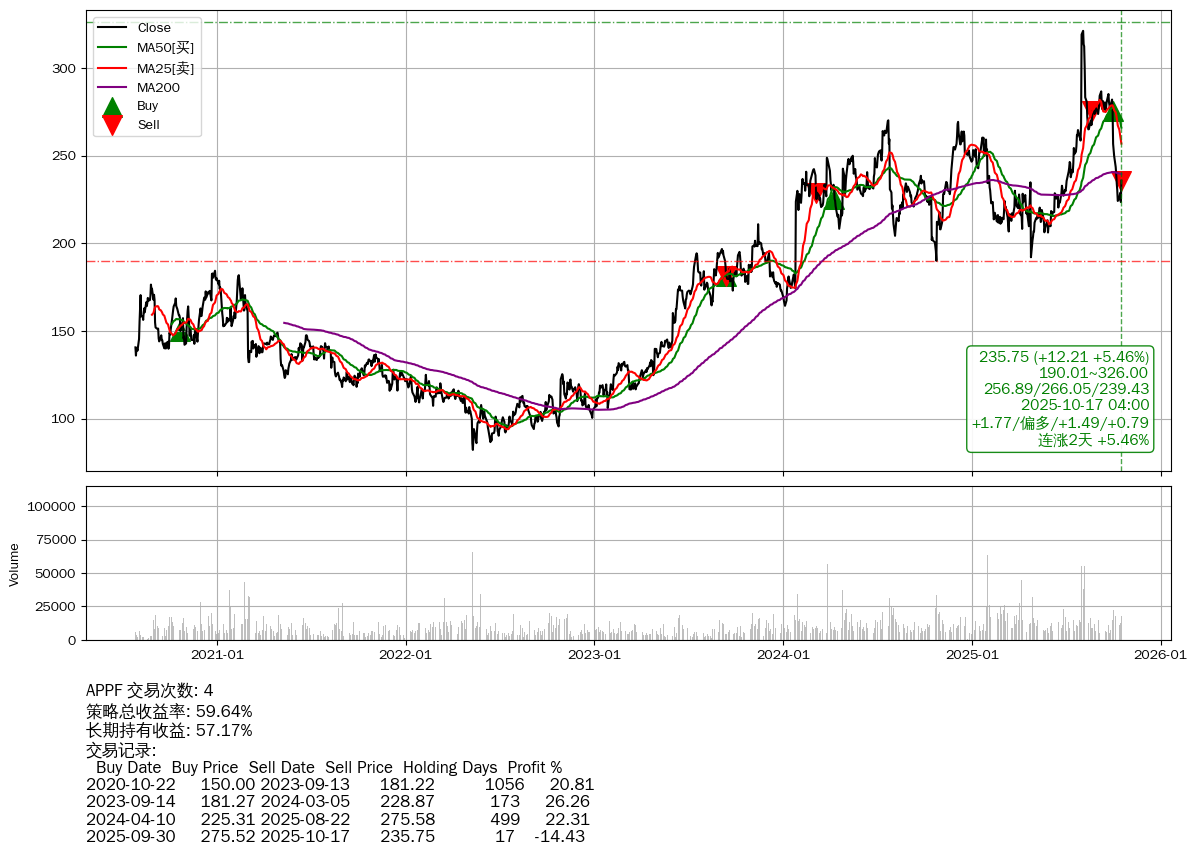 | 45 | APPF | $235.65(+12.37 +5.54% 2025-10-17 15:59) | 📈涨破 MA5/10 均线 📈连涨2天 +5.46% 📉回撤 2025-08-05 -26.60% (73天) 223.54(2025-10-16) → 321.20(2025-08-04) (-30.40%) | +59.64% | +57.17% | +2.48% | 4 | 偏多/1.49/0.79 | 2020-07-27~2025-10-17 |