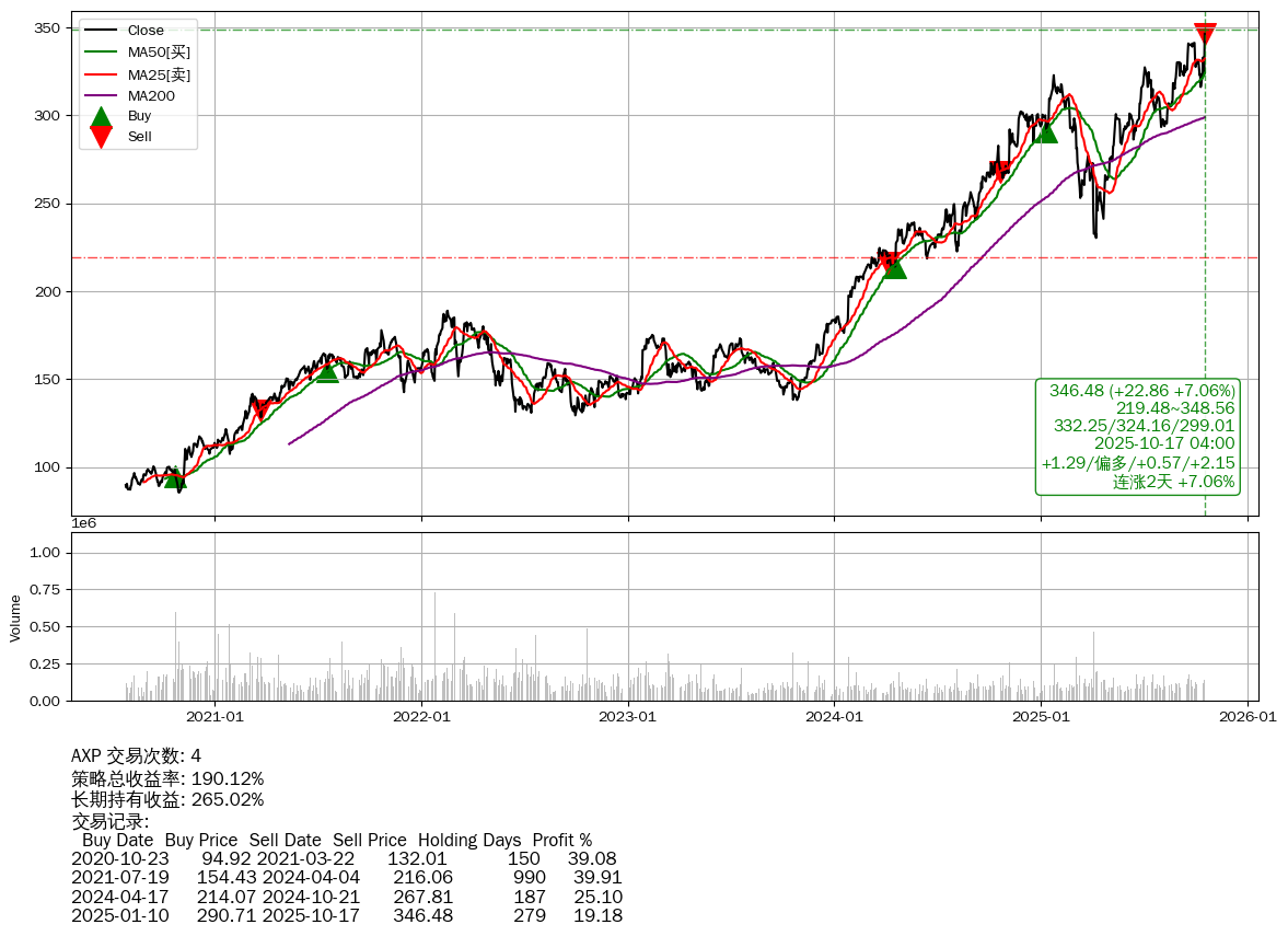 | 15 | AXP | $346.51(+23.27 +7.20% 2025-10-17 15:59) | 📈涨破 MA5/10/25/50 均线 📈涨破 52周高点 (348.56) 📈连涨2天 +7.06% | +190.12% | +265.02% | -74.91% | 4 | 偏多/0.57/2.15 | 2020-07-27~2025-10-17 |