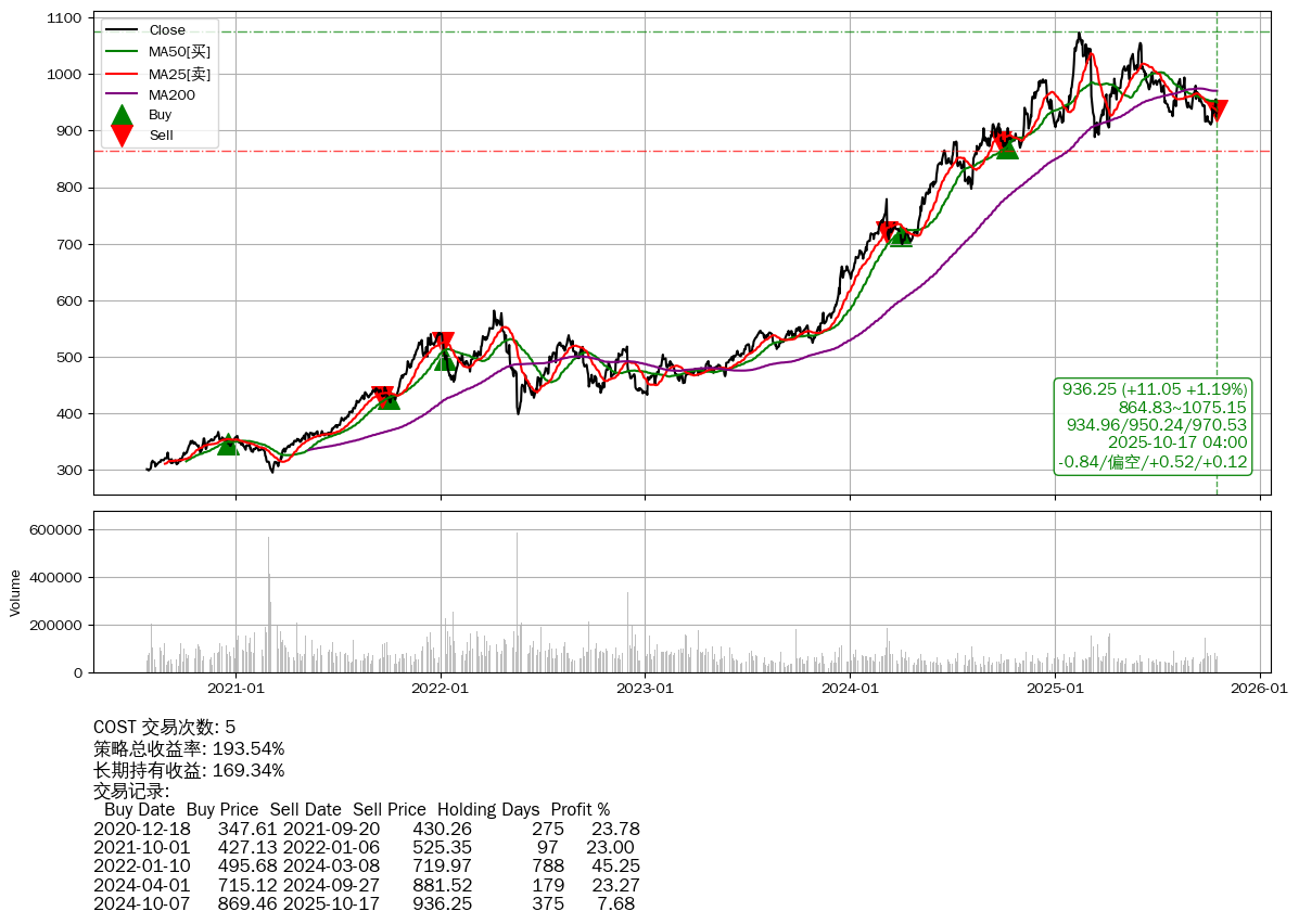 | 13 | ★COST | $936.11(+10.55 +1.14% 2025-10-17 15:59) | 📈涨破 MA10/25 均线 📉回撤 2025-02-14 -12.78% (244天) 888.74(2025-03-13) → 1073.41(2025-02-13) (-17.20%) | +193.54% | +169.34% | +24.20% | 5 | 偏空/0.52/0.12 | 2020-07-27~2025-10-17 |