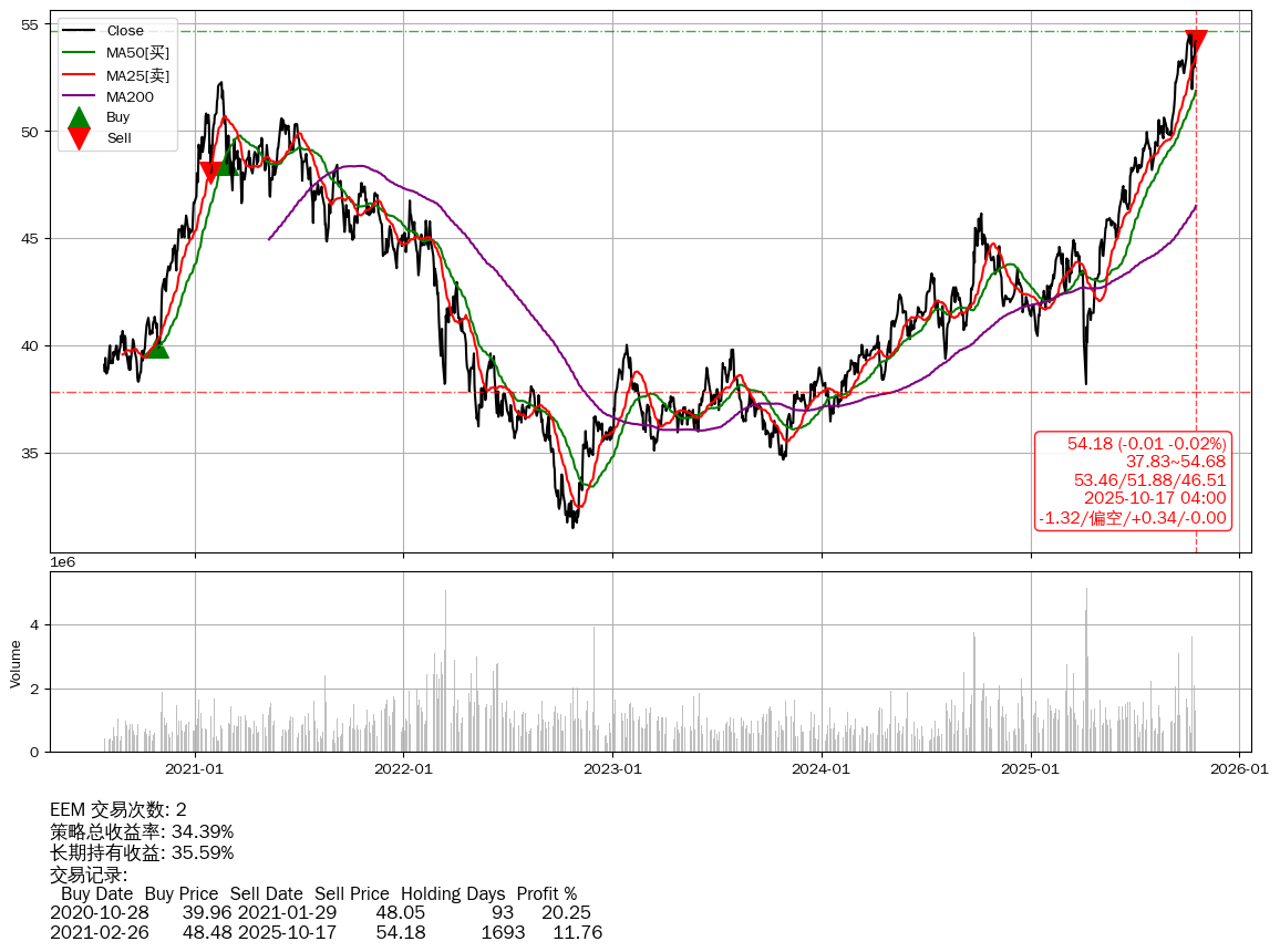 | 53 | ★EEM | $54.19(-0.00 -0.00% 2025-10-17 15:59) | 📉回撤 2025-10-09 -0.55% (8天) 51.95(2025-10-10) → 54.48(2025-10-06) (-4.64%) | +34.39% | +35.59% | -1.19% | 2 | 偏空/0.34/-0.00 | 2020-07-27~2025-10-17 |
