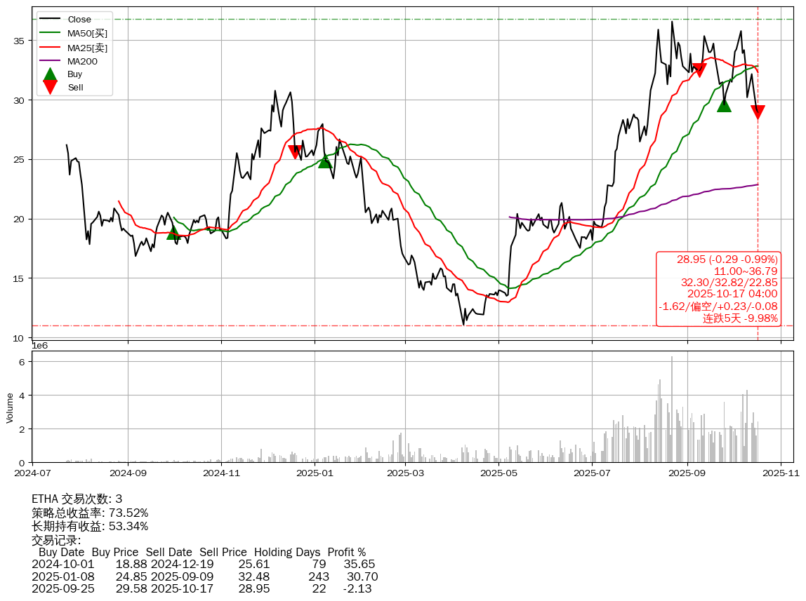| 41 | ★ETHA | $28.94(-0.31 -1.06% 2025-10-17 15:59) | 📉连跌5天 -9.98% 📉回撤 2025-08-25 -20.86% (53天) 28.95(2025-10-17) → 36.58(2025-08-22) (-20.86%) | +73.52% | +53.34% | +20.18% | 3 | 偏空/0.23/-0.08 | 2024-07-23~2025-10-17 |