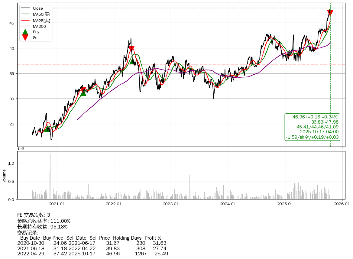 | 34 | ★FE | $46.96(+0.16 +0.34% 2025-10-17 15:59) | 📈涨破 MA10 均线 📉回撤 2025-10-16 -1.51% (1天) 46.80(2025-10-16) → 47.68(2025-10-15) (-1.85%) | +111.00% | +95.18% | +15.83% | 3 | 偏空/0.19/0.03 | 2020-07-27~2025-10-17 |