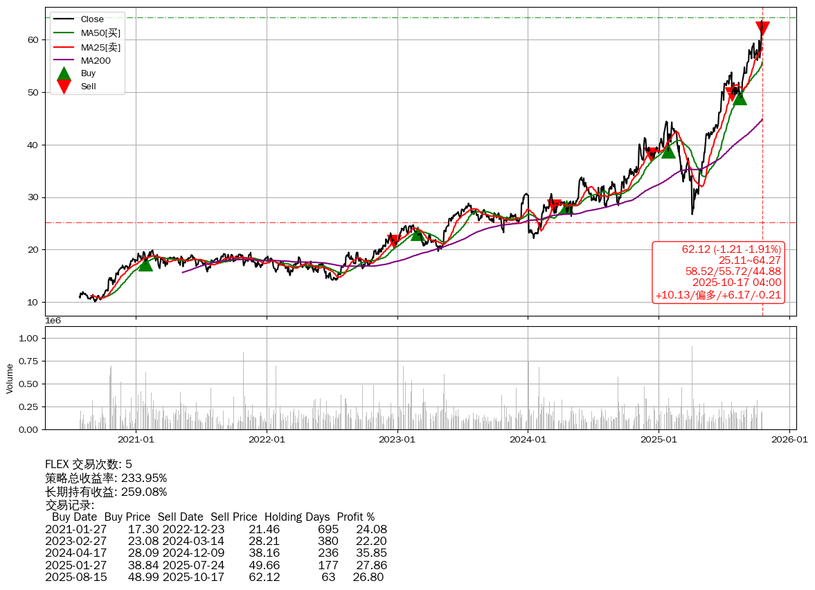| 10 | ★FLEX | $62.14(-1.19 -1.88% 2025-10-17 15:59) | 📉回撤 2025-10-16 -2.37% (1天) 62.12(2025-10-17) → 63.62(2025-10-15) (-2.37%) | +233.95% | +259.08% | -25.12% | 5 | 偏多/6.17/-0.21 | 2020-07-27~2025-10-17 |