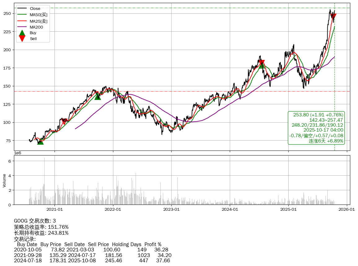 | 22 | ★GOOG | $253.82(+1.94 +0.77% 2025-10-17 15:59) | 📈连涨6天 +6.89% 📉回撤 2025-09-22 -0.54% (25天) 237.44(2025-10-10) → 255.19(2025-09-19) (-6.96%) | +151.76% | +243.81% | -92.05% | 3 | 偏空/0.57/0.08 | 2020-07-27~2025-10-17 |