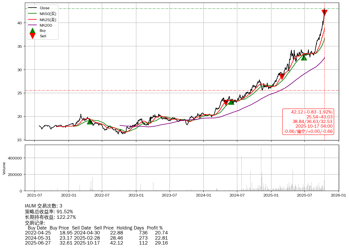 | 38 | IAUM | $42.12(-0.82 -1.91% 2025-10-17 15:59) | 📈涨破 52周高点 (43.03) 📉回撤 2025-10-17 -1.92% (0天) 42.12(2025-10-17) → 42.95(2025-10-16) (-1.92%) | +91.52% | +122.27% | -30.75% | 3 | 偏空/0/-0.66 | 2021-07-26~2025-10-17 |