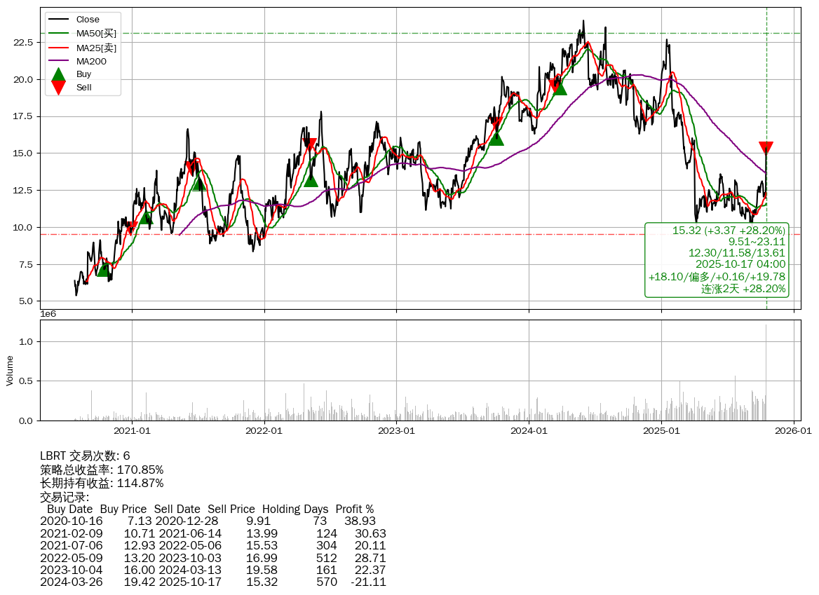 | 19 | LBRT | $15.32(+3.39 +28.42% 2025-10-17 15:59) | 📈涨破 MA5/10/25/200 均线 📈连涨2天 +28.20% 📉回撤 2024-06-03 -36.06% (501天) 9.87(2025-04-08) → 23.96(2024-05-31) (-58.80%) | +170.85% | +114.87% | +55.98% | 6 | 偏多/0.16/19.78 | 2020-07-27~2025-10-17 |