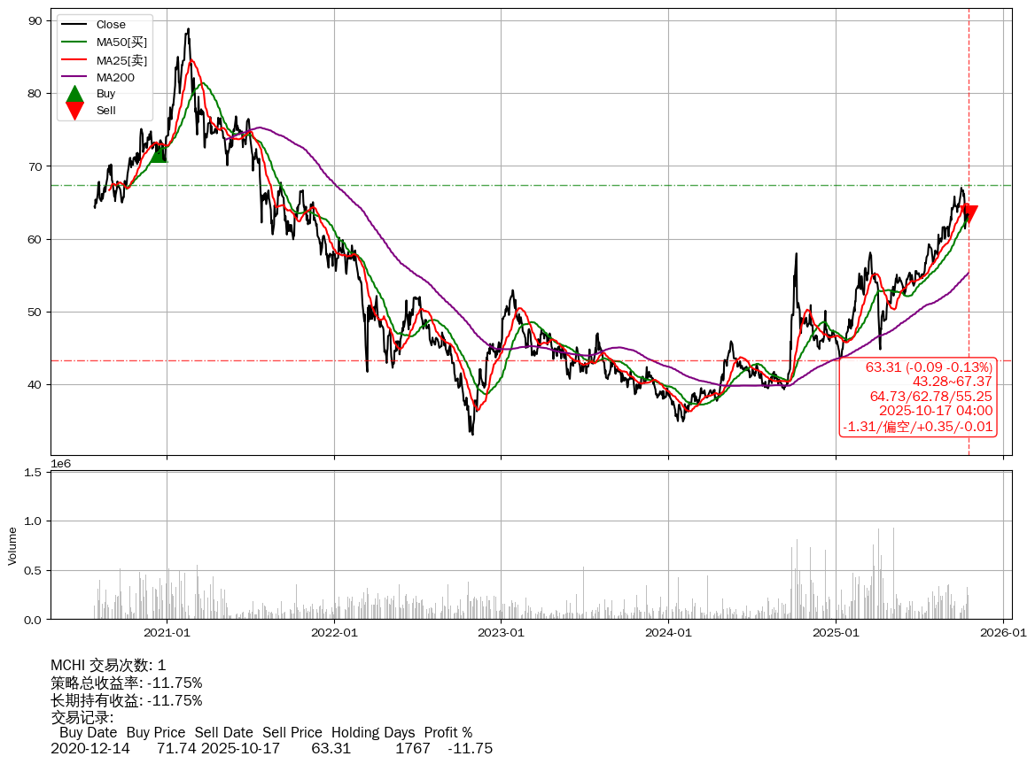 | 55 | ★MCHI | $63.30(-0.10 -0.16% 2025-10-17 15:59) | 📉回撤 2021-02-18 -28.76% (1701天) 33.03(2022-10-31) → 88.87(2021-02-17) (-62.83%) | -11.75% | -11.75% | +0.00% | 1 | 偏空/0.35/-0.01 | 2020-07-27~2025-10-17 |