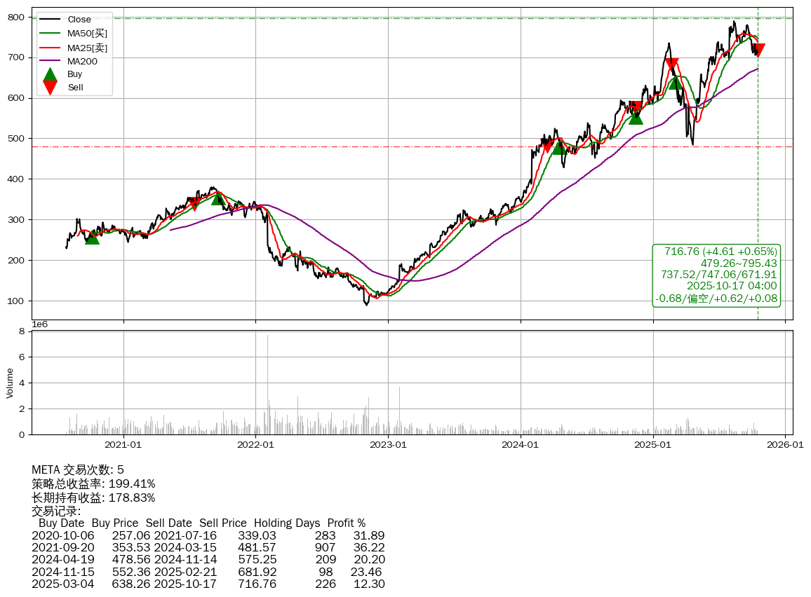 | 12 | ★META | $716.67(+4.61 +0.65% 2025-10-17 15:59) | 📈涨破 MA5/10 均线 📉回撤 2025-08-13 -9.19% (65天) 705.38(2025-10-10) → 789.26(2025-08-12) (-10.63%) | +199.41% | +178.83% | +20.58% | 5 | 偏空/0.62/0.08 | 2020-07-27~2025-10-17 |