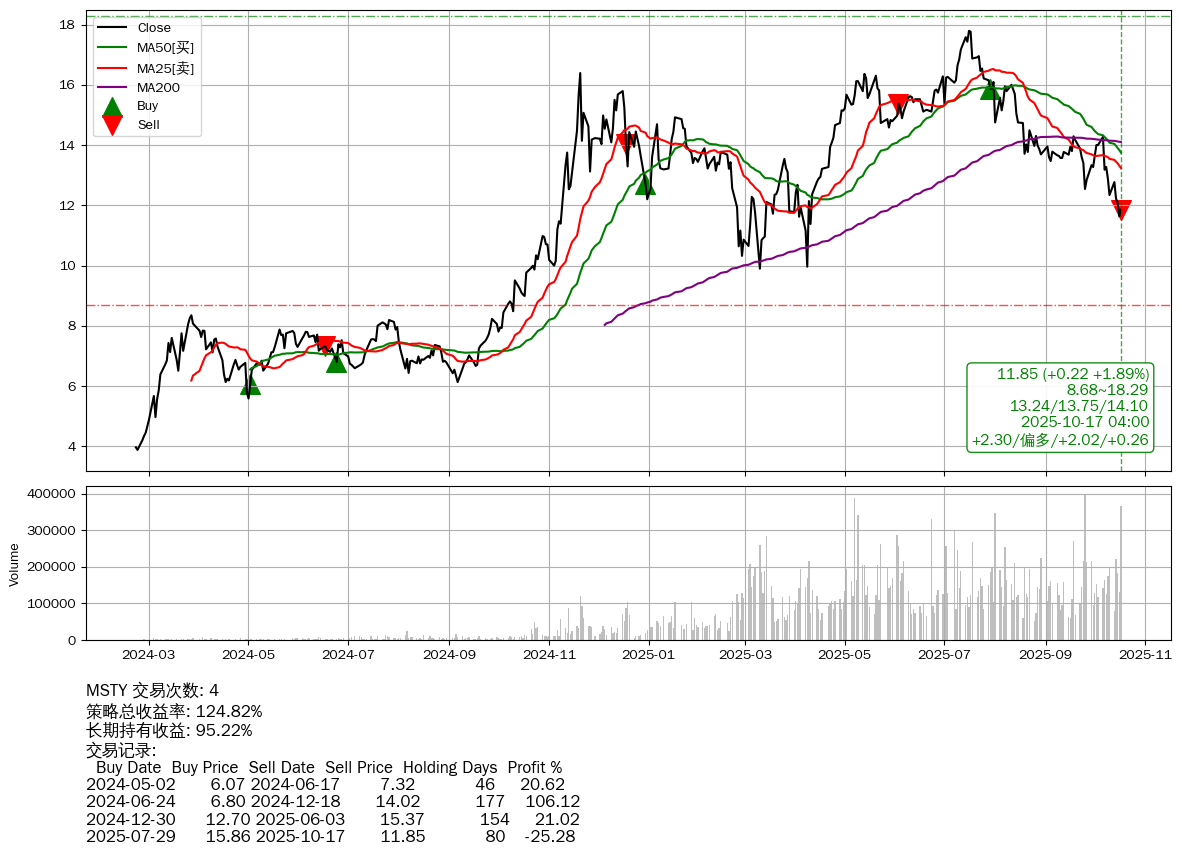 | 28 | 🟢MSTY | $11.86(+0.22 +1.89% 2025-10-17 15:59) | 📉回撤 2025-07-17 -33.39% (92天) 11.63(2025-10-16) → 17.79(2025-07-16) (-34.63%) | +124.82% | +95.22% | +29.60% | 4 | 偏多/2.02/0.26 | 2024-02-22~2025-10-17 |