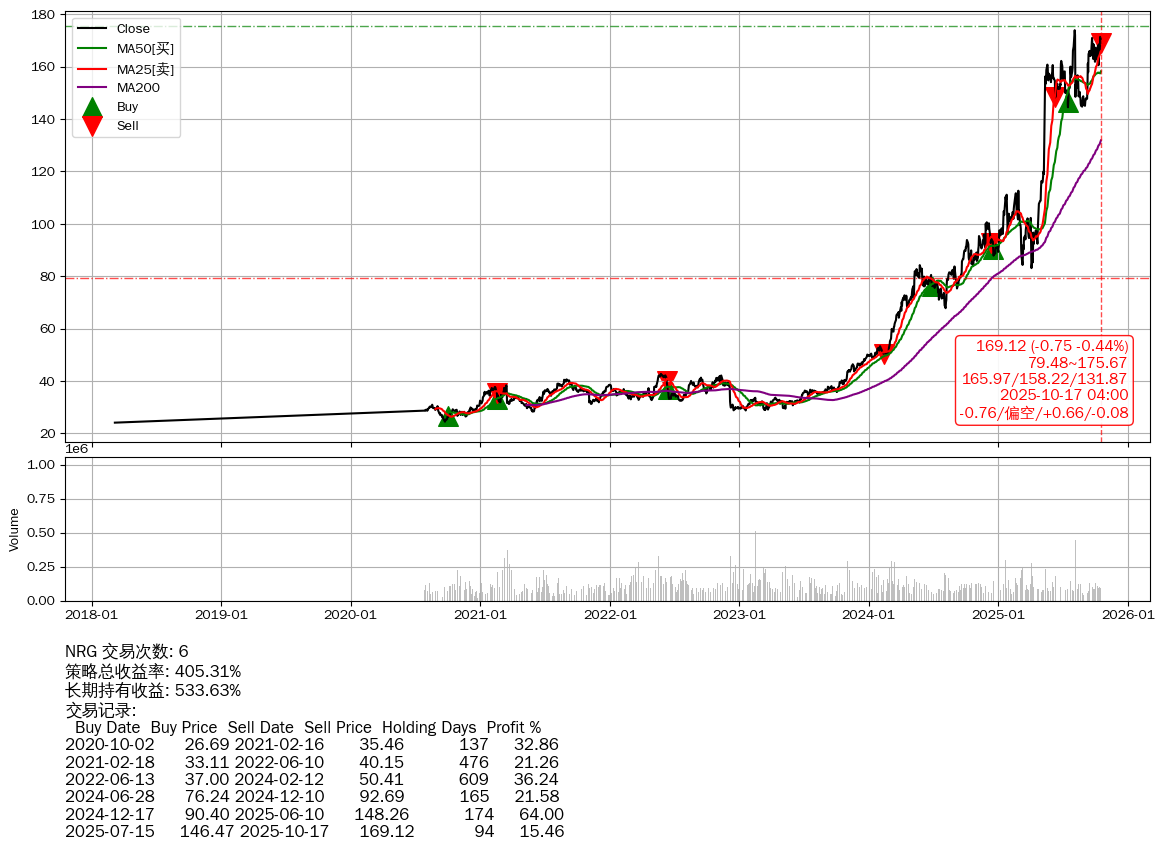 | 5 | ★NRG | $168.76(-1.23 -0.72% 2025-10-17 15:59) | 📉回撤 2025-08-05 -2.77% (73天) 144.76(2025-08-25) → 173.94(2025-08-04) (-16.78%) | +405.31% | +533.63% | -128.32% | 6 | 偏空/0.66/-0.08 | 2018-03-07~2025-10-17 |