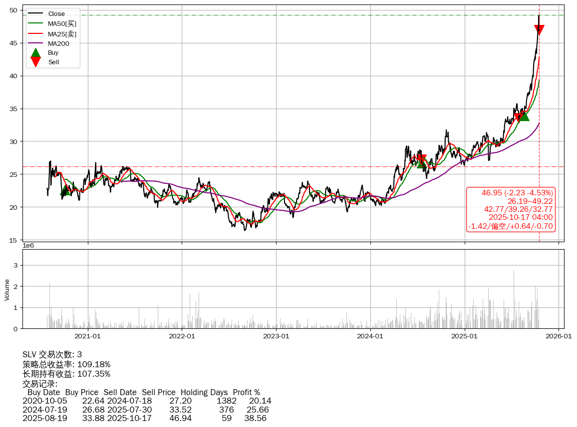 | 36 | ★SLV | $46.95(-2.22 -4.51% 2025-10-17 15:59) | 📉跌破 MA5 均线 📉回撤 2025-10-17 -4.53% (0天) 46.95(2025-10-17) → 49.17(2025-10-16) (-4.53%) | +109.18% | +107.35% | +1.83% | 3 | 偏空/0.64/-0.70 | 2020-07-27~2025-10-17 |