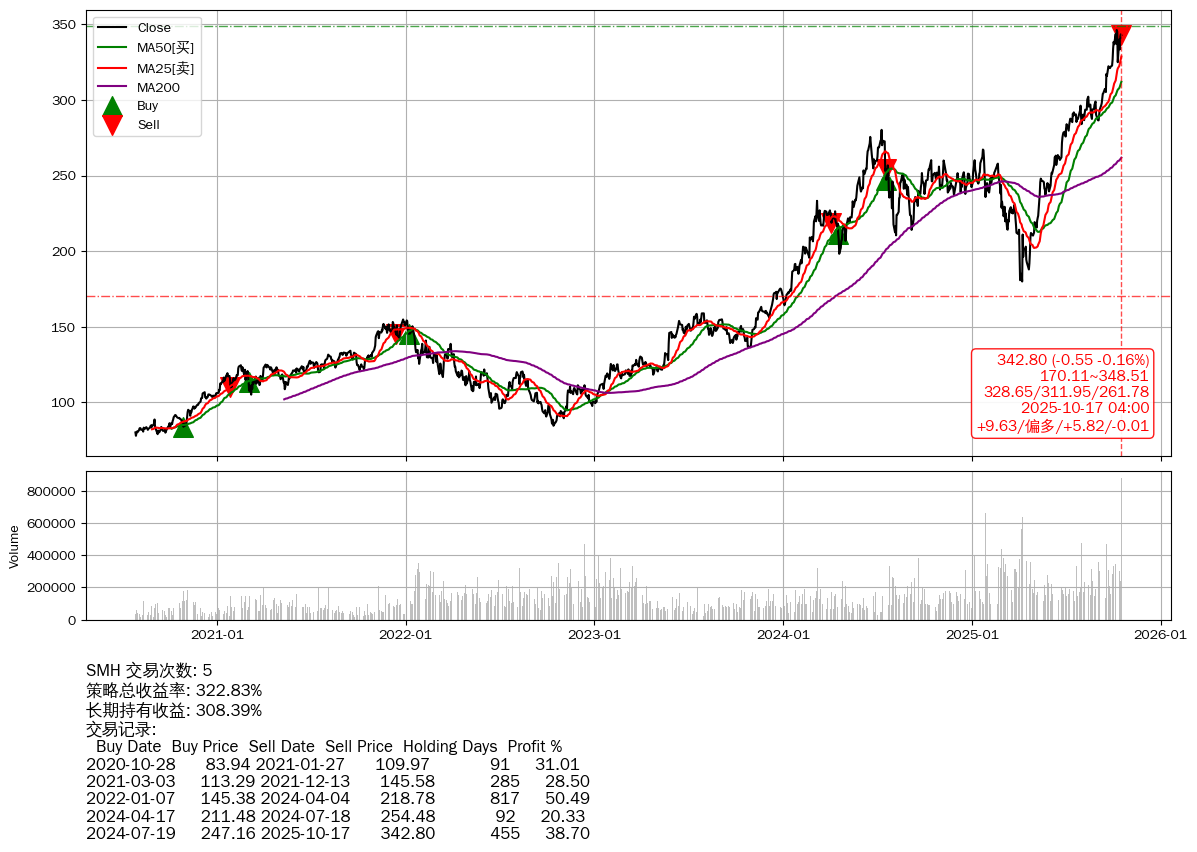 | 7 | ★SMH | $342.83(-0.55 -0.16% 2025-10-17 15:59) | 📉回撤 2025-10-09 -0.97% (8天) 324.90(2025-10-10) → 346.17(2025-10-08) (-6.14%) | +322.83% | +308.39% | +14.44% | 5 | 偏多/5.82/-0.01 | 2020-07-27~2025-10-17 |