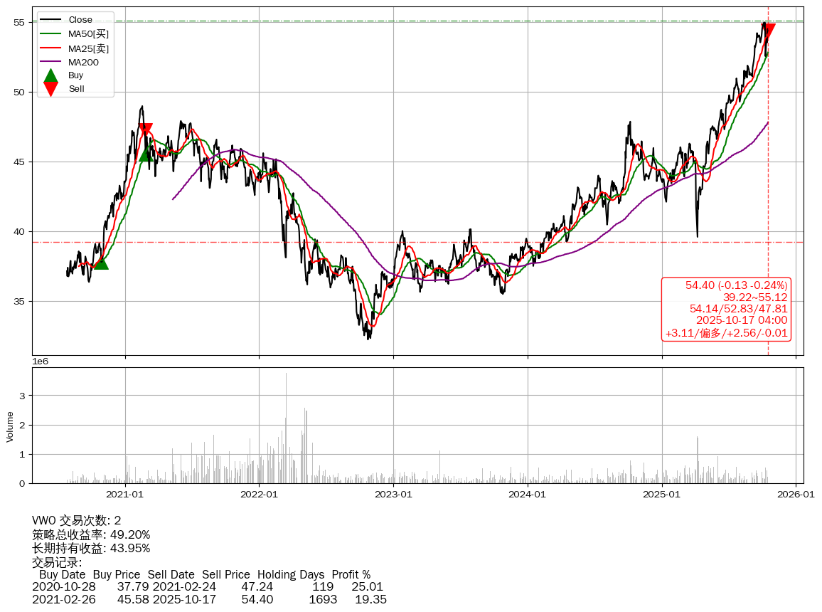 | 49 | ★VWO | $54.38(-0.13 -0.24% 2025-10-17 15:59) | 📉回撤 2025-10-09 -1.06% (8天) 52.55(2025-10-10) → 54.98(2025-10-08) (-4.43%) | +49.20% | +43.95% | +5.25% | 2 | 偏多/2.56/-0.01 | 2020-07-27~2025-10-17 |