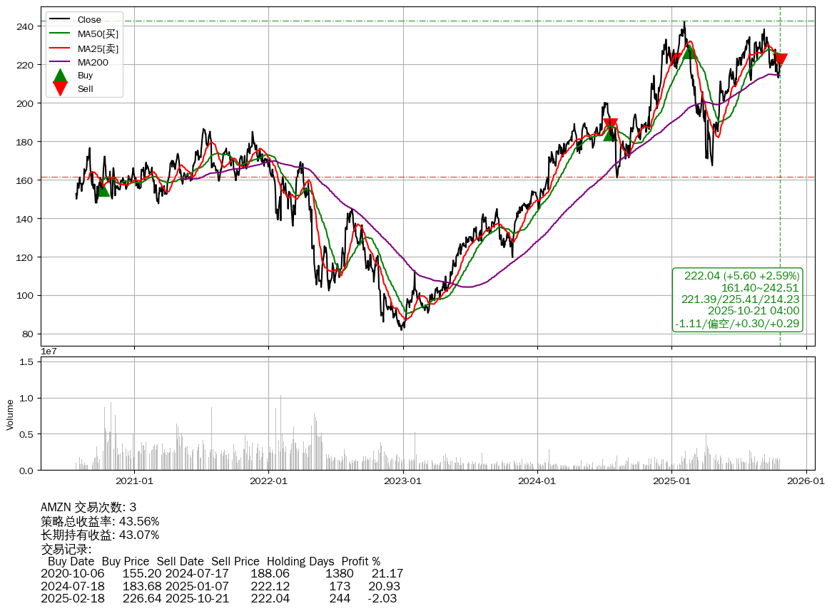 | 43 | ★AMZN | $222.03(+5.56 +2.57% 2025-10-21 15:59) | 📈涨破 MA10/25 均线 📉回撤 2025-02-05 -8.26% (257天) 167.35(2025-04-21) → 242.02(2025-02-04) (-30.85%) | +43.56% | +43.07% | +0.49% | 3 | 偏空/0.3/0.29 | 2020-07-27~2025-10-21 |