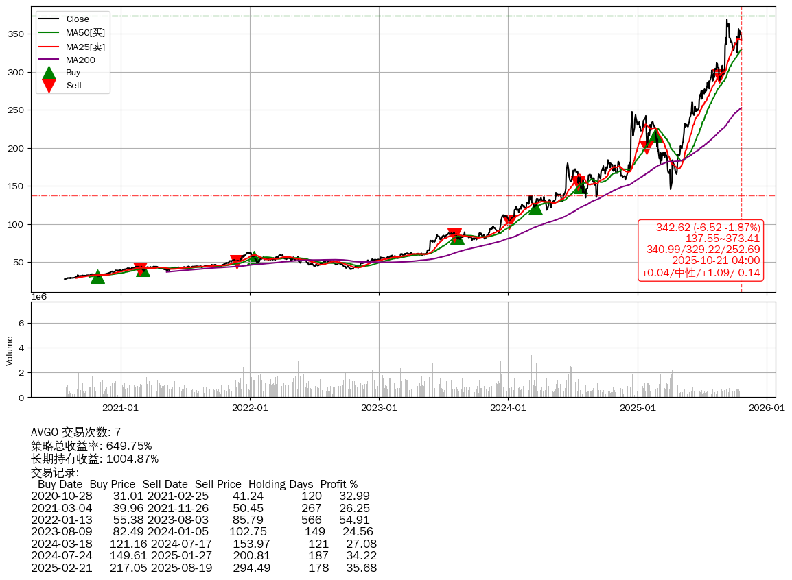 | 4 | ★AVGO | $342.67(-6.49 -1.86% 2025-10-21 15:59) | 📉跌破 MA10 均线 📉回撤 2025-09-11 -7.12% (40天) 324.66(2025-10-10) → 368.87(2025-09-10) (-11.99%) | +649.75% | +1004.87% | -355.12% | 7 | 中性/1.09/-0.14 | 2020-07-27~2025-10-21 |