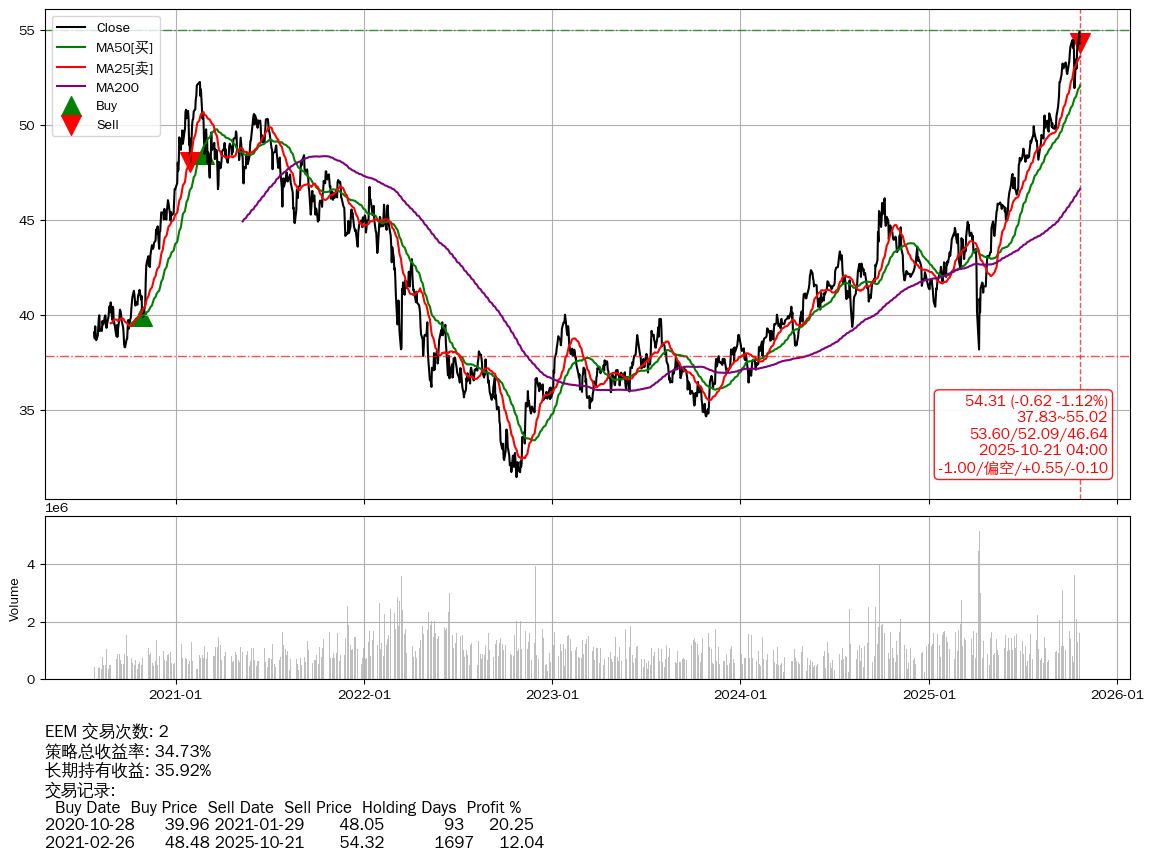 | 45 | ★EEM | $54.32(-0.61 -1.11% 2025-10-21 15:59) | 📉回撤 2025-10-21 -1.12% (0天) 54.31(2025-10-21) → 54.93(2025-10-20) (-1.12%) | +34.73% | +35.92% | -1.20% | 2 | 偏空/0.55/-0.10 | 2020-07-27~2025-10-21 |